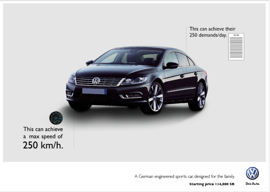 The VW CC is a German engineered sports car, perfect for your midlife crisis since it still satisfies the family. A tactical print campaign for auto-related and business KSA Magazines